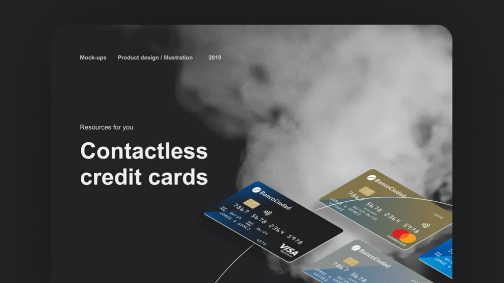 Contactless Credit Card Mockup with different brands to showcase your partners like Visa and Mastercard. This mockup comes with some presentations of the card. Layout with customisable card design (front), shadows and background.